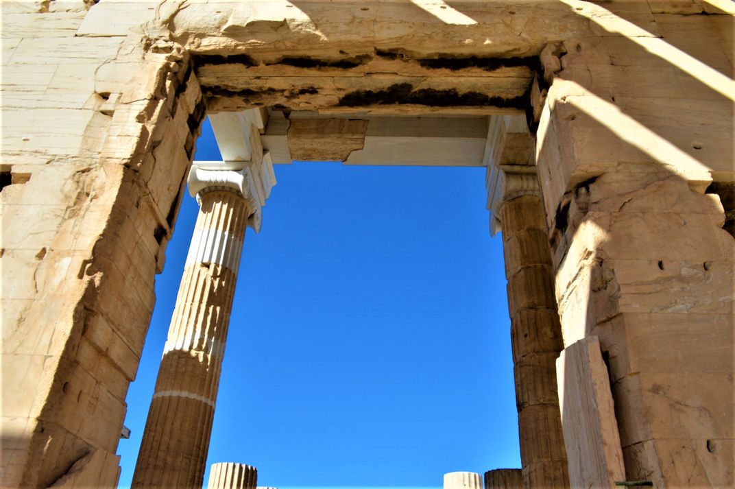 This photograph is from the top of the Acropolis. The Acropolis of Athens is an ancient citadel and it is located on a rocky outcrop above the city of Athens and contains the remains of several ancient buildings of great architectural and historical significance. While there is evidence that the hill was inhabited as far back as the fourth millennium BC, it was Pericles (c. 495–429 BC) in the fifth century BC who coordinated the construction of the buildings. After learning the history, I decided to visit the world famous construction of ancient time. The photo is showing a part of the structure on the top of the Acropolis.