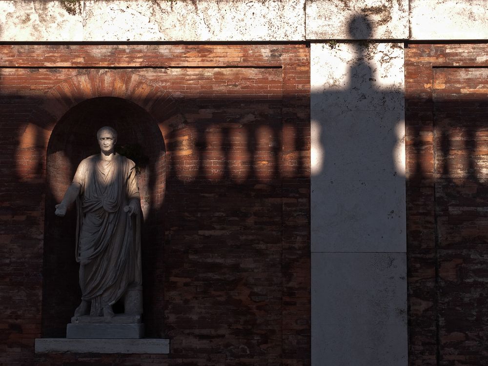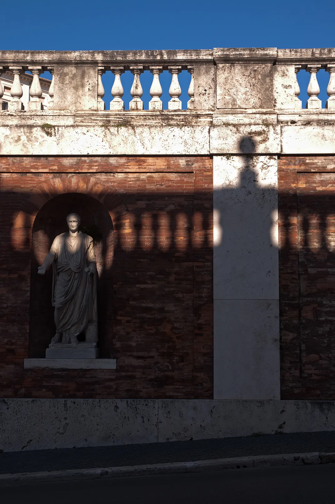 Ancient stone statue in mottled light on Via della Dataria, Rome.