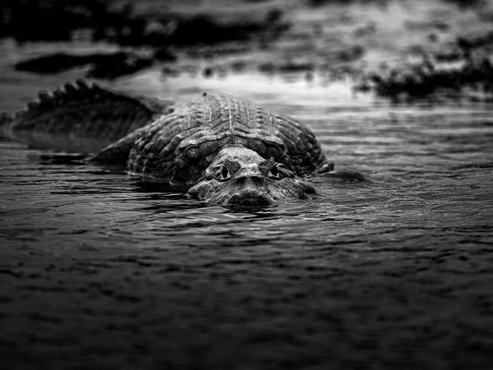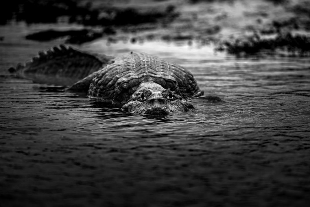 A caiman rises head-on from shallow water, its rugged skin illuminated in black and white to reveal the timeless presence of this ancient predator.