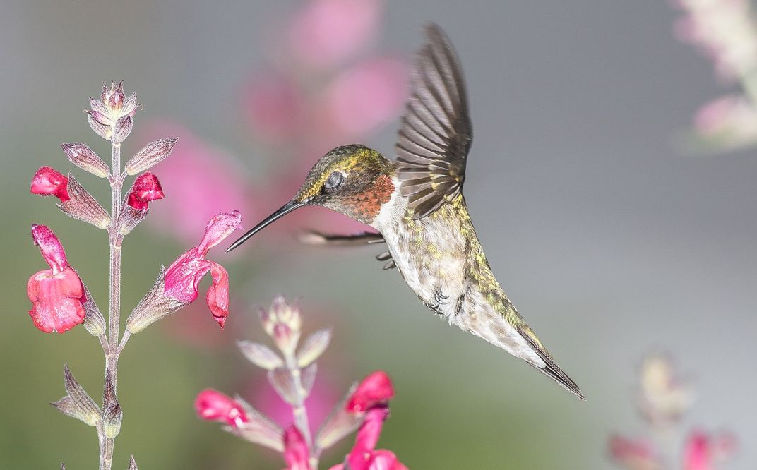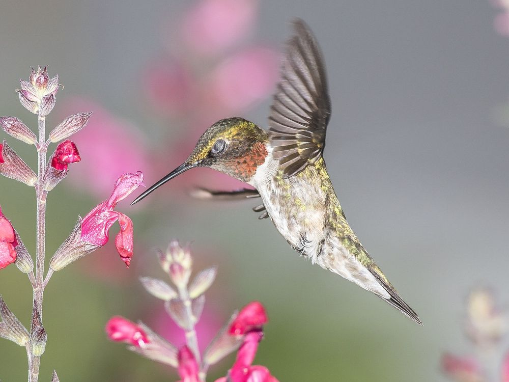 A ruby throated hummingbird seems to be savoring a sip of nectar, closing its eyes and drinking it in.