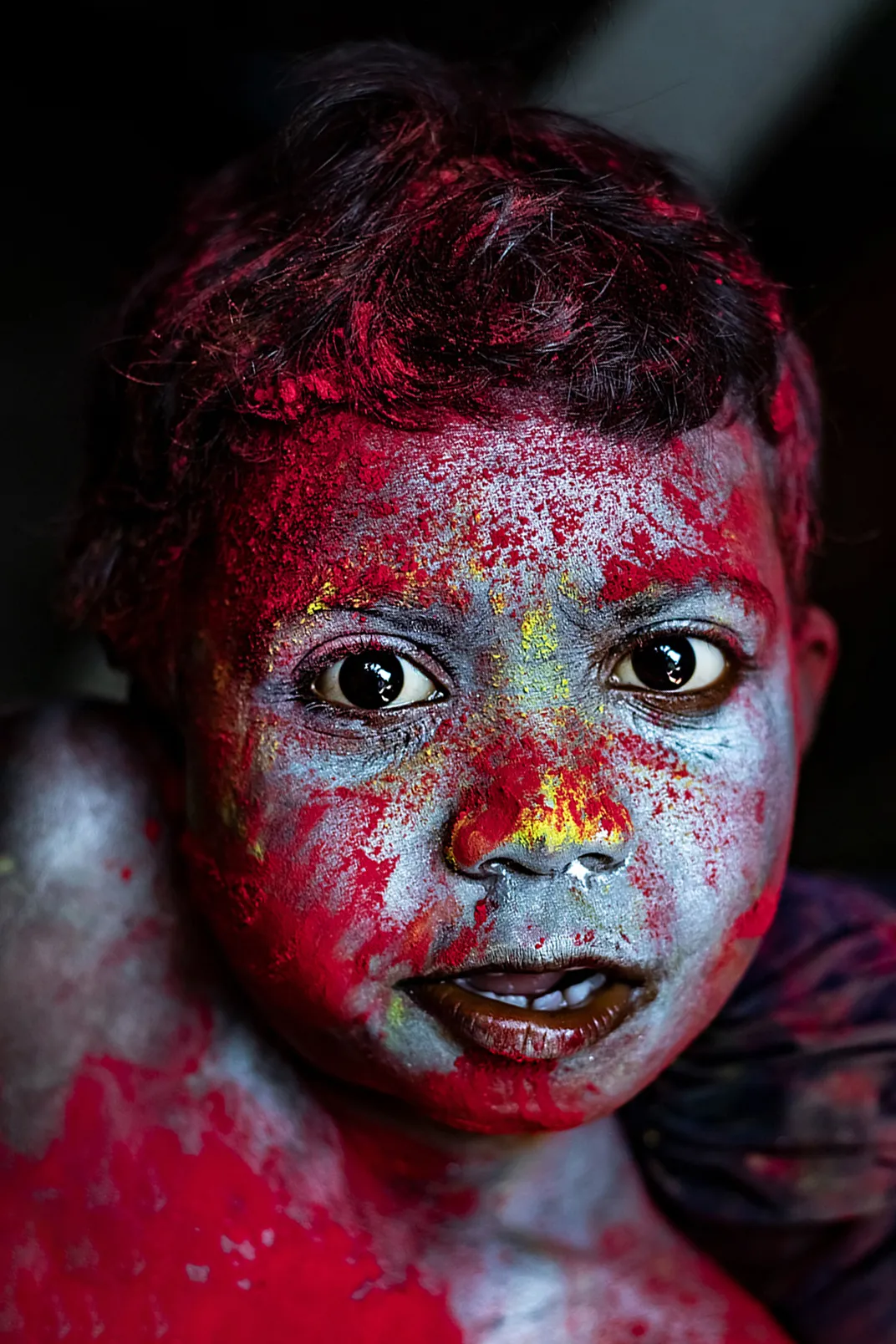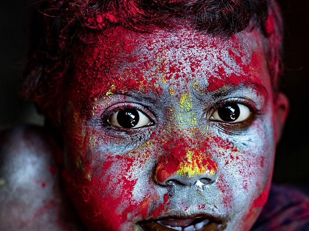 Colors of Innocence A child covered in festival colors gazes into the camera with raw curiosity and purity. The vibrant hues tell a story of joy, tradition, and the simple beauty of human expression found in everyday Indian life.