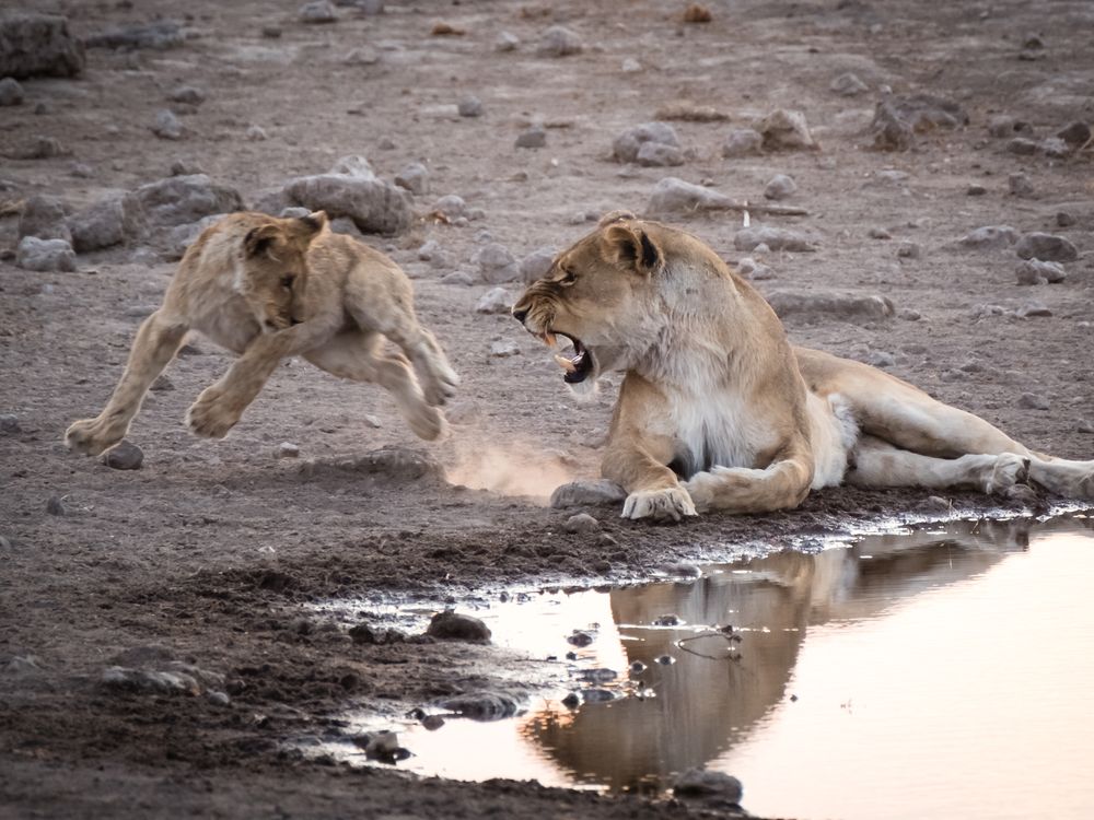 A lioness being a little annoyed by her cub.