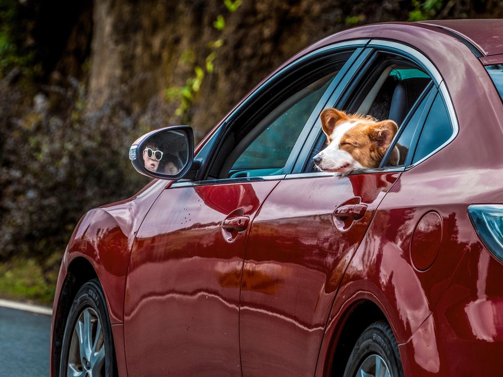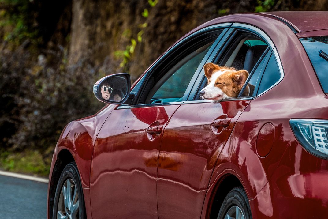 Before the journey, a yellow-haired dog couldn't wait to stick its head out of the car window, wearing a contented smile, full of anticipation for the upcoming trip. Unintentionally, the heads of two people also quietly appeared in the left rearview mirror, adding a touch of unexpected charm and warmth to this lively scene. Photographed on September 28, 2024, in Guangchang County, Jiangxi Province, China.