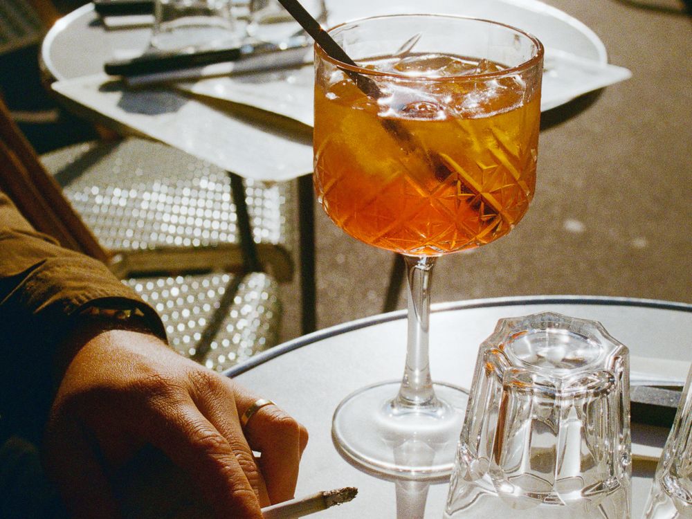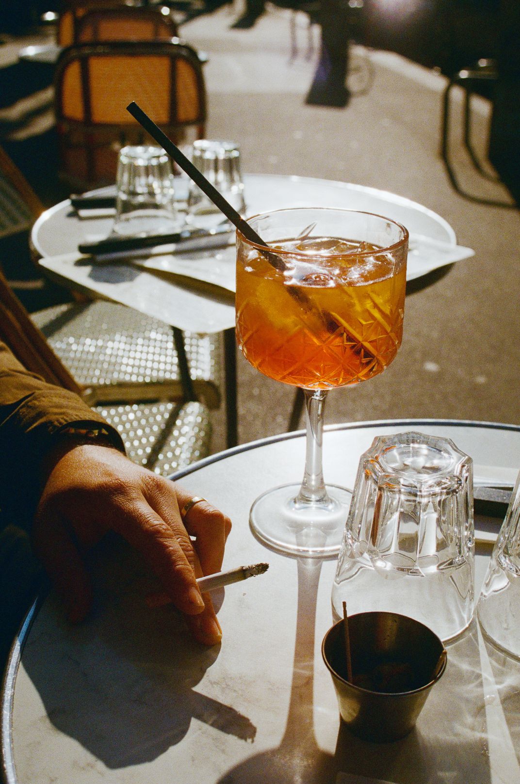 35mm photo of drinks on a cafe table in Paris, taken October 2025.