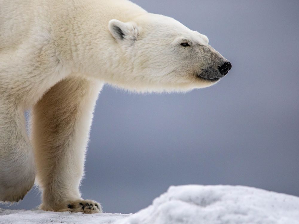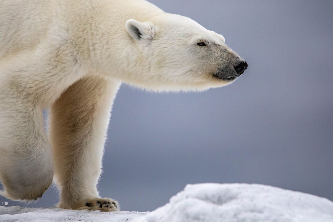 A young female polar bear walks along the shore in Karl XII Oya, Svalbard.