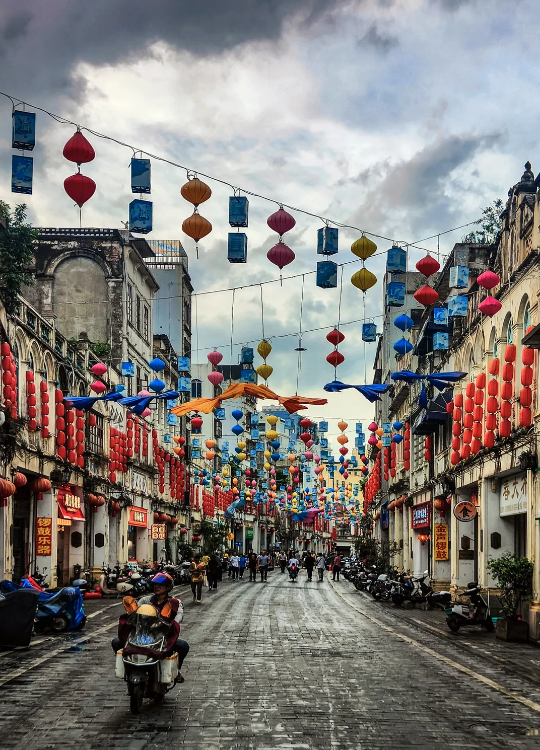 Haikou’s Arcade Old Street, dampened by drizzle, holds Nanyang memories. A treaty port since 1858, it linked Nanyang and inland. In 1924, Hainanese overseas Chinese built "arcade buildings" (shops below, corridors above) with volcanic rocks, blending Baroque carvings and Nanyang windows. In the photo: colorful lanterns on bluestone, slow motorcycles, strolling pedestrians. The old "shop rows" vibe lingers in mist. A "National Top 10 Historical Street" (2009), it’s still a living part of today.
