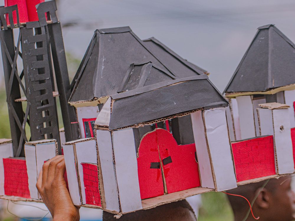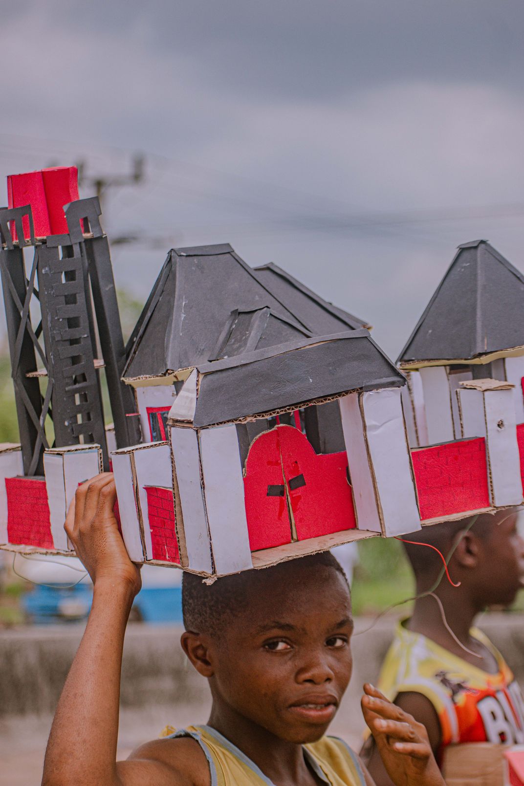 At the border of Anambra State, Nigeria, security protocols force passengers to disembark and walk across the checkpoint while vehicles are searched. Amidst this tension and transit, a young boy marches forward, balancing a complex cardboard mansion on his head. Complete with a water tower and gates, his creation is a masterpiece of recycled materials—a symbol of the ingenuity and architectural dreams thriving in the streets.