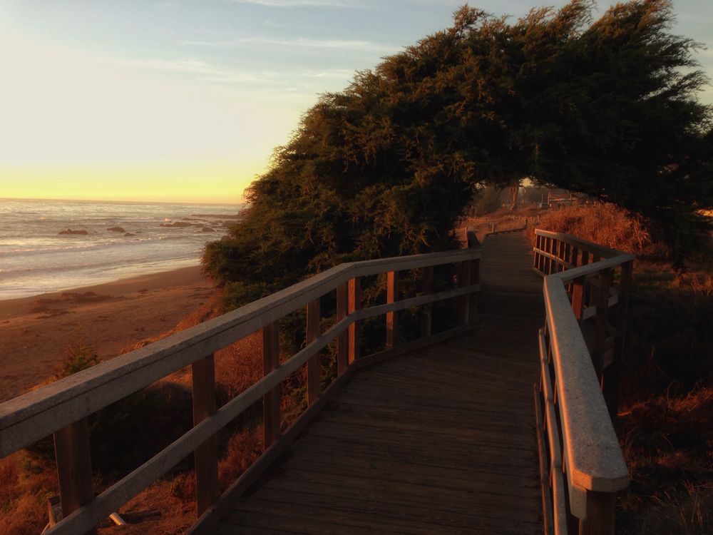 A windbent cypress creates a nature arch long Moonstone Beach at sunset.