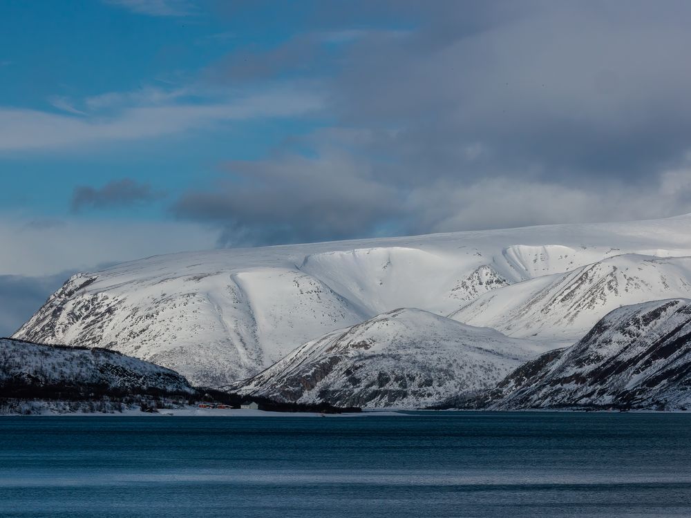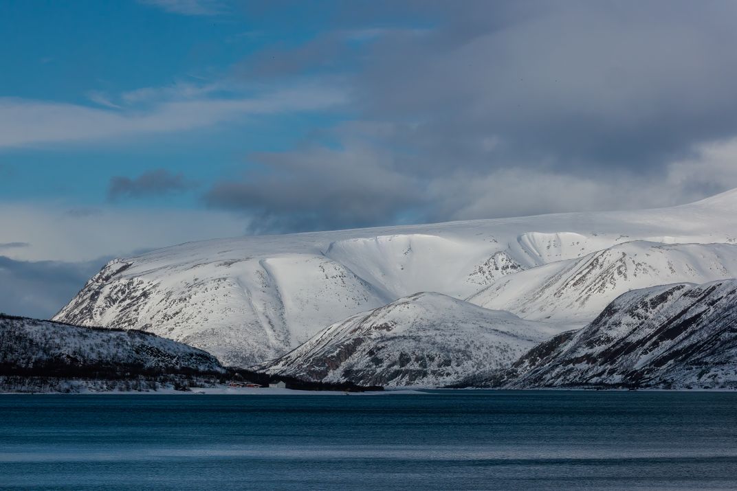 This is a throwing shot photo from a moving vehicle to an Arctic Ocean fjord and northern Norwegian Mountains.