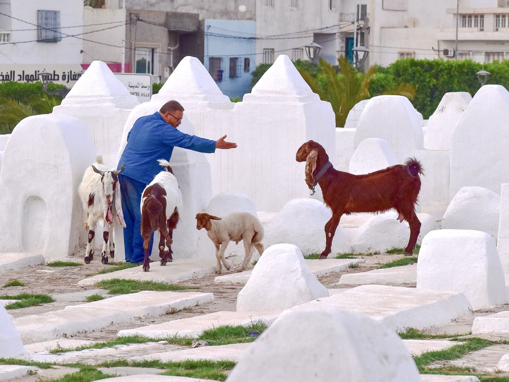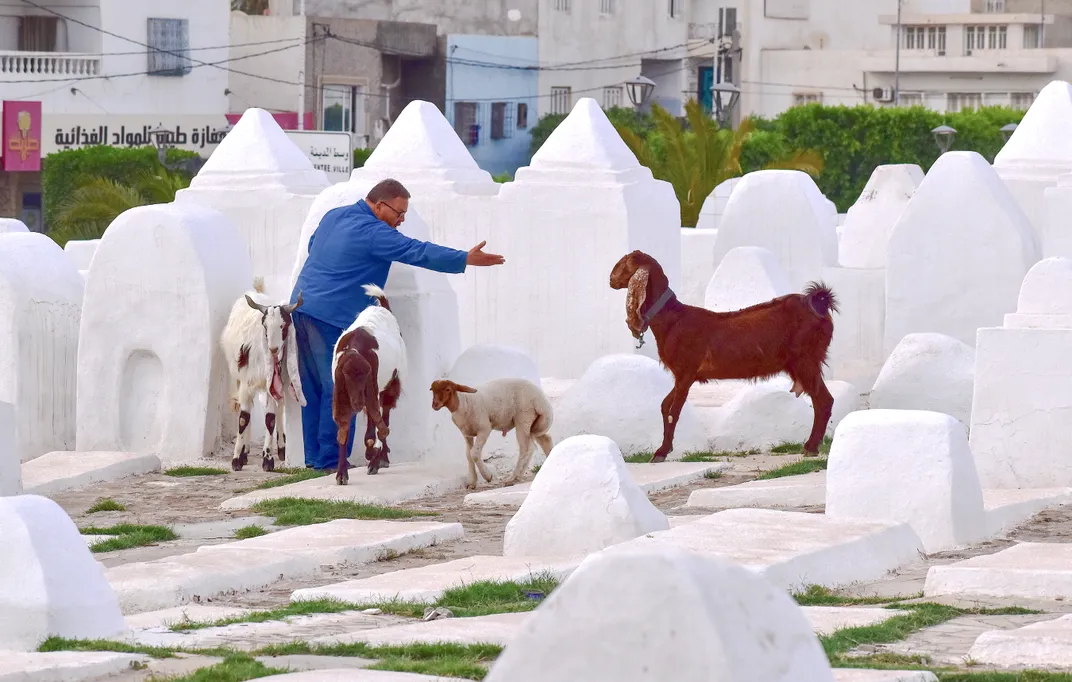 A man tries to convince his stubborn goat to leave an ancient cemetery in front of the revered Grand Mosque of Kairouan, Tunisia.