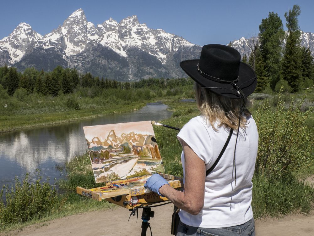 A plein-air artist paints the Teton Range at Schwabacher Landing in Wyoming. Her canvas, tools, and the surrounding landscape reflect a long American tradition of depicting the West directly from life.