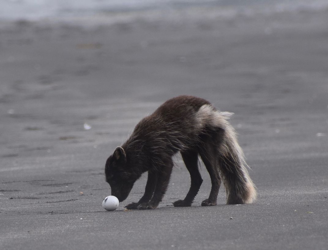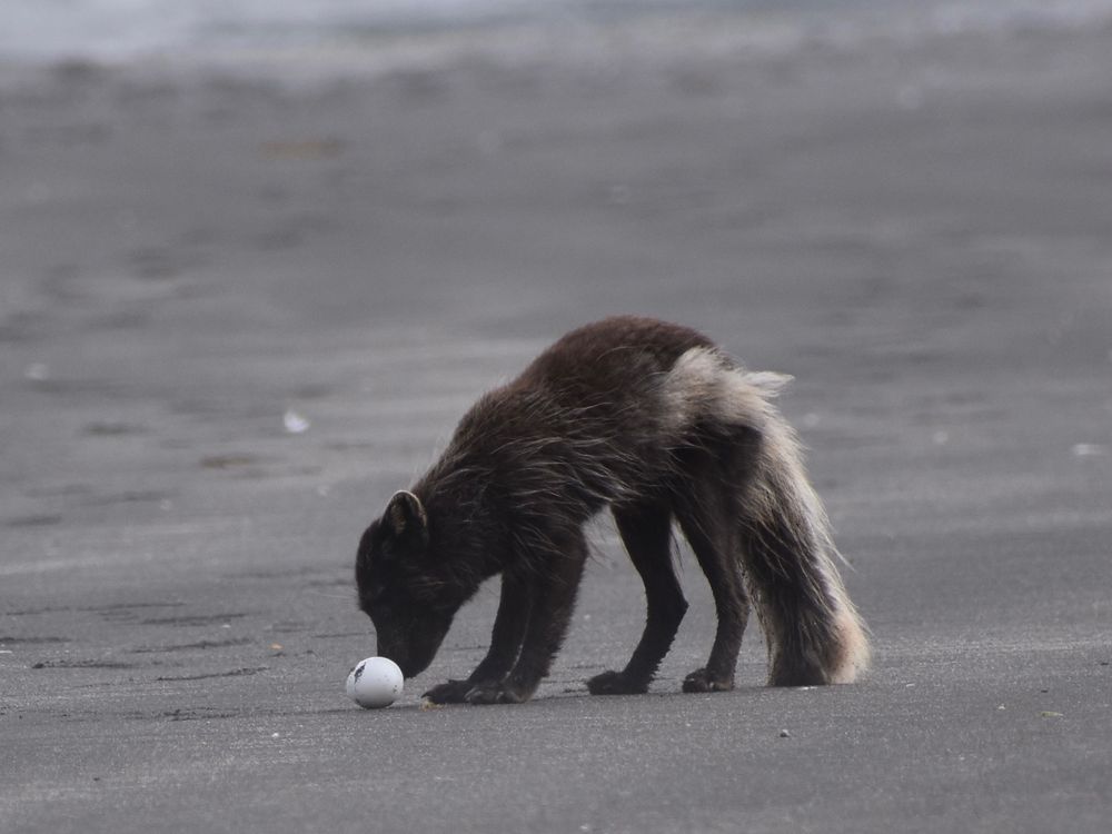 Artic Fox finds egg on beach.