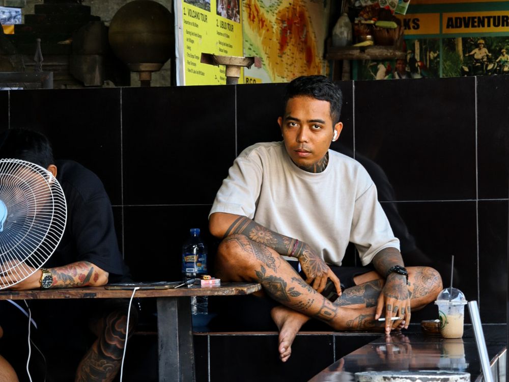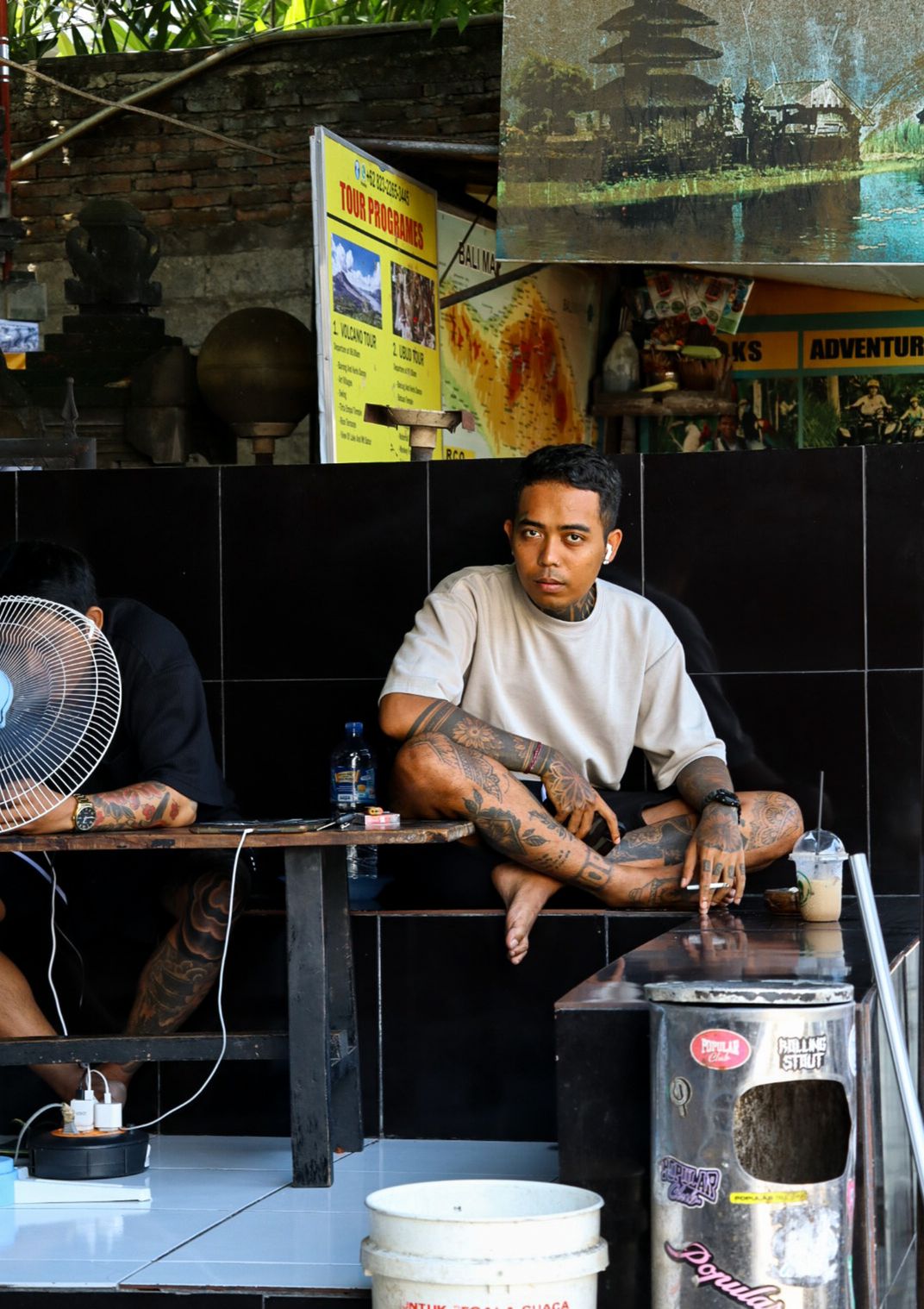 A tattoo artist waits in the hot heat for customers. As he waits, he smokes, he thinks, waiting for the fan to blow his way.