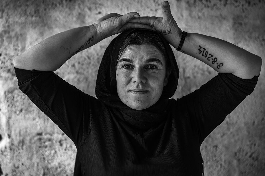Layle is 35 years old. She tattooed the names of her sons on her right hand once she was the captive of ISIS, Adnan & Osman. On her left hand, the tattoo of a date can be seen, the date of ISIS attack to their city that changed their whole destiny. Her husband's name i.e. Kero was also tattooed on her left hand. She tattooed them using blood, ash and breast milk. By the defeat of ISIS, Adnan, who was their captive to be educated as a force of war, could escape from their base and he found his mother in the camp of refugees. Layle is unaware of her husband and son's destiny and so is Adnan.