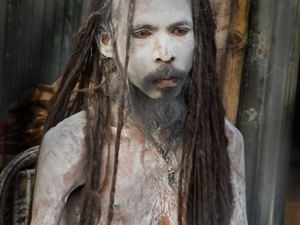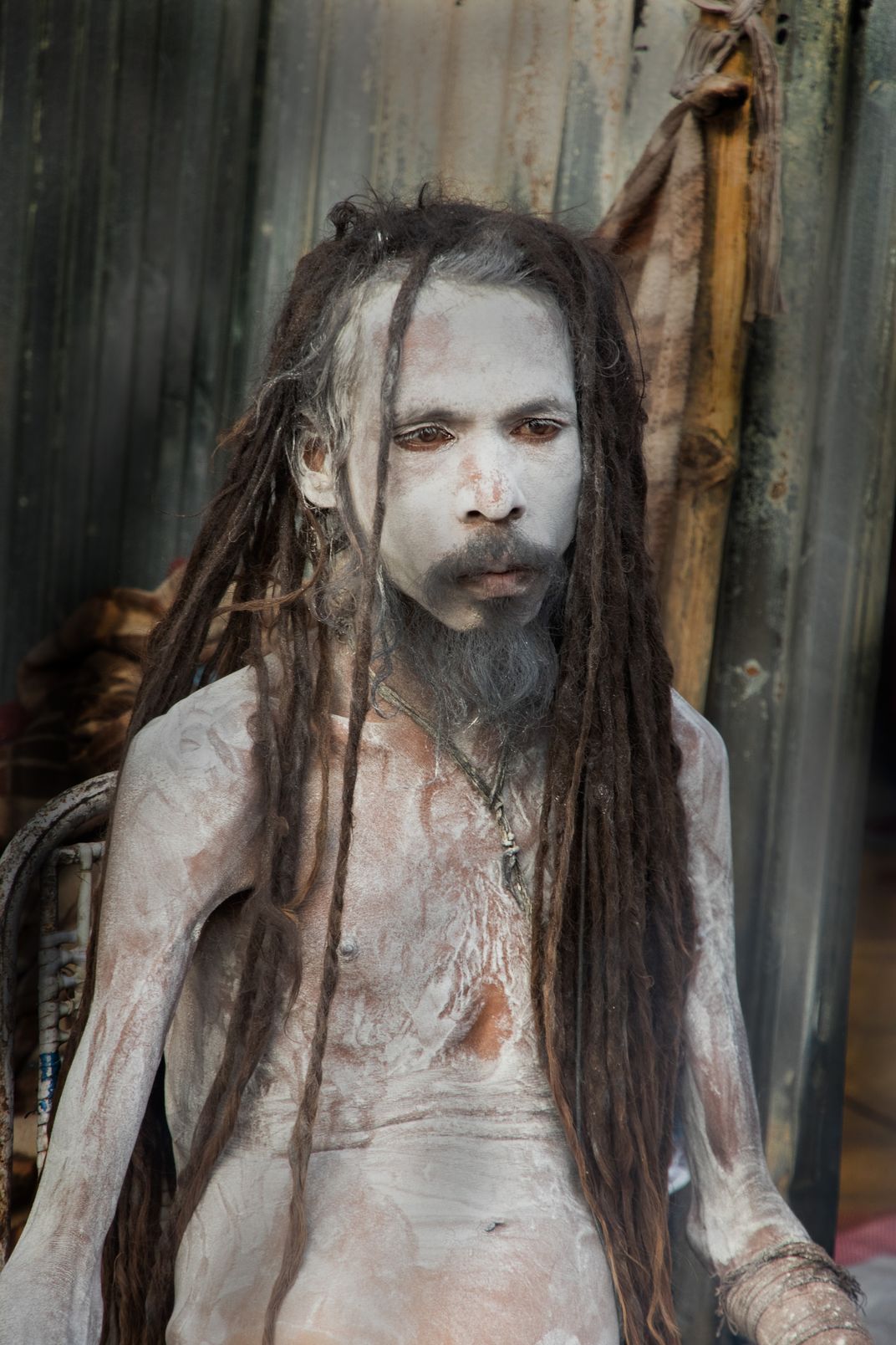A portrait of spiritual intensity.Covered in vibhuti(sacred ash),a Naga Sadhu-an ascetic monk-awaits the auspicious rituals and sacred dip at the Ganga Sagar Transit Campin Kokata,India.His powerful gaze and matted jata hair reflect a lifetime of rigorous devotion on the path where Ganga river meets the Bay of Bengl.