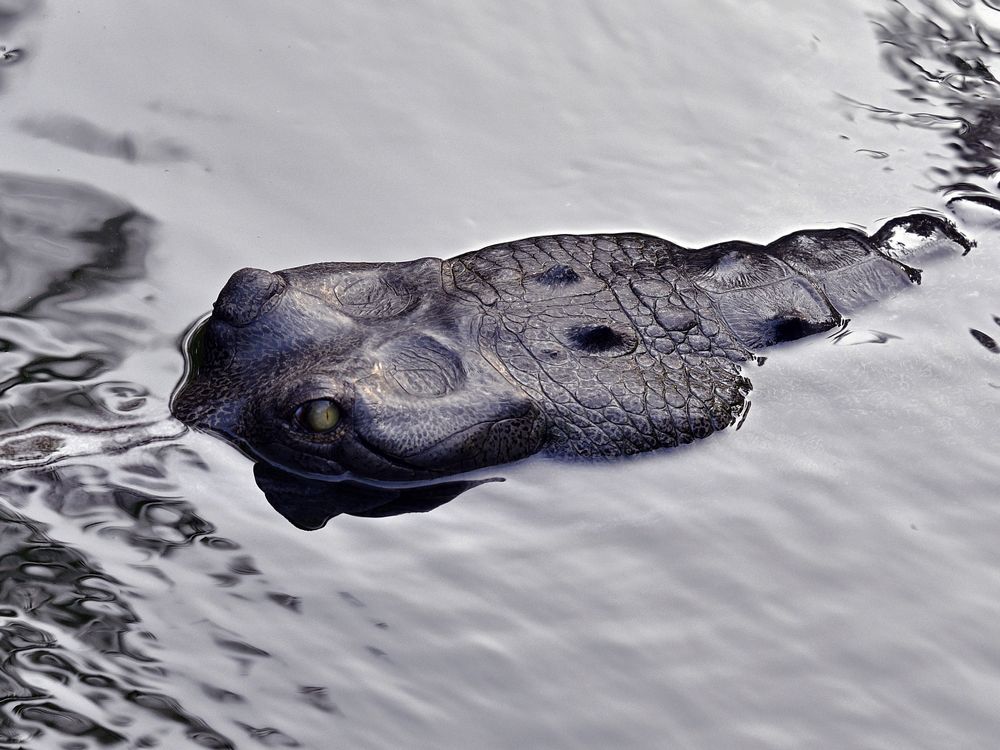 This Photo is showing a Crocodile with its bright green eyes and long nose in shallow murky water the body is hardly visible in the water.