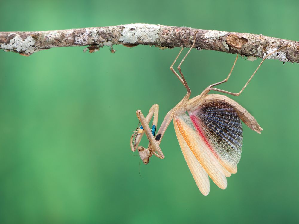 ???????? ????????, common name Asian jumping mantis is a species of mantis native to South East Asia, it could be found in China, Japan, Korea and Sri Lanka. When praying mantids feels itself is threatened, they stand tall and spread their forelegs to allow them to penetrate the target, with their wings fanning out wide and mouths open. The fanning of the wings is used to make the mantis seem larger and to scare the opponent.