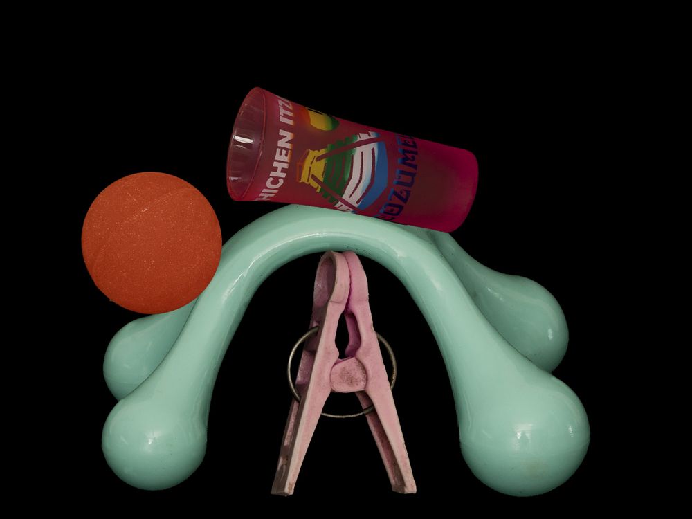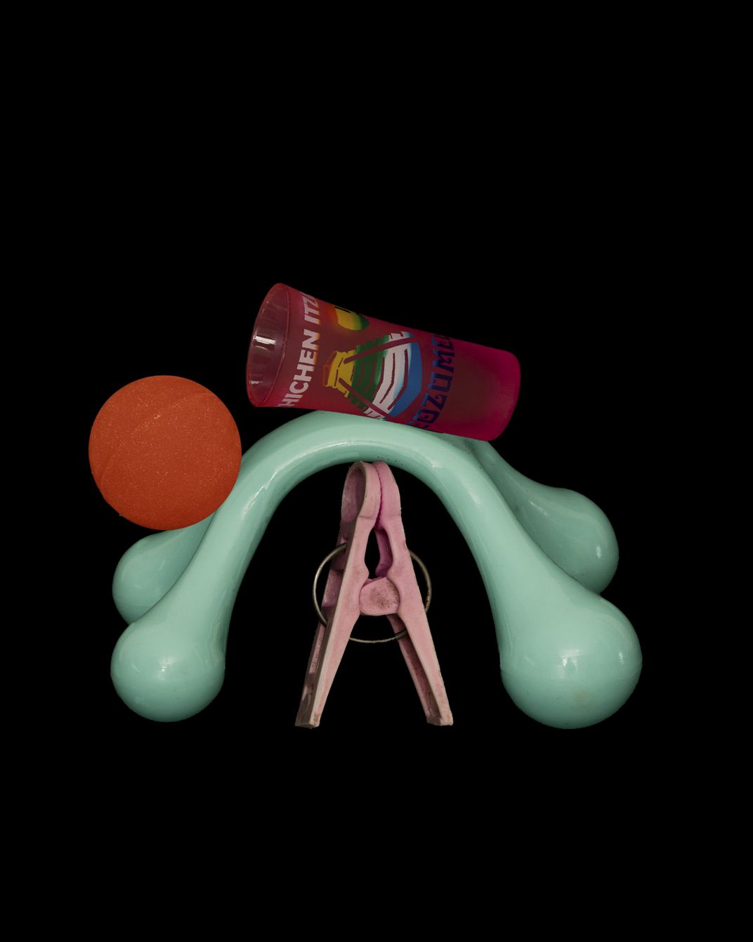 This photo is part of the project called token. in which I created a series of digital collages from photographs of my everyday objects. The idea is to break down these objects usual functions, making you ponder new meanings, about their purpose, how we use them, and our consumption habits. In this image: A plastic hook, a plastic massager, a cup and my nephew's ball.
