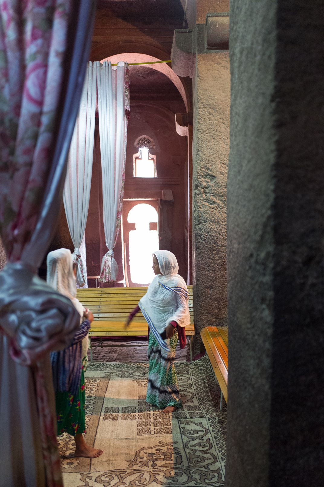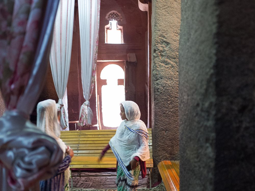 Christmas pilgrims inside Bet Medhane Alem, the biggest of all rock-hewn churches in Lalibela and a UNESCO World Heritage site.