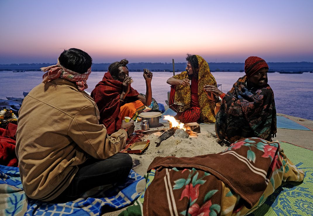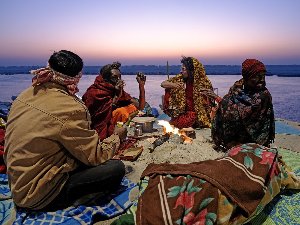 Some saints are in a gossiping mood on a Ghat on the bank of the river Ganges in the morning at Varanasi, India.