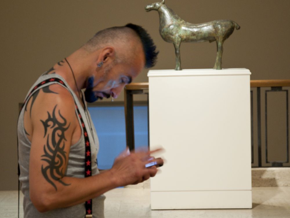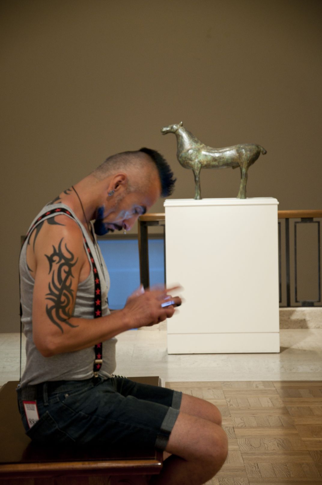 This is taken at the Portland Art Museum where a patron is taking a break to see what going on outside the exhibition space.