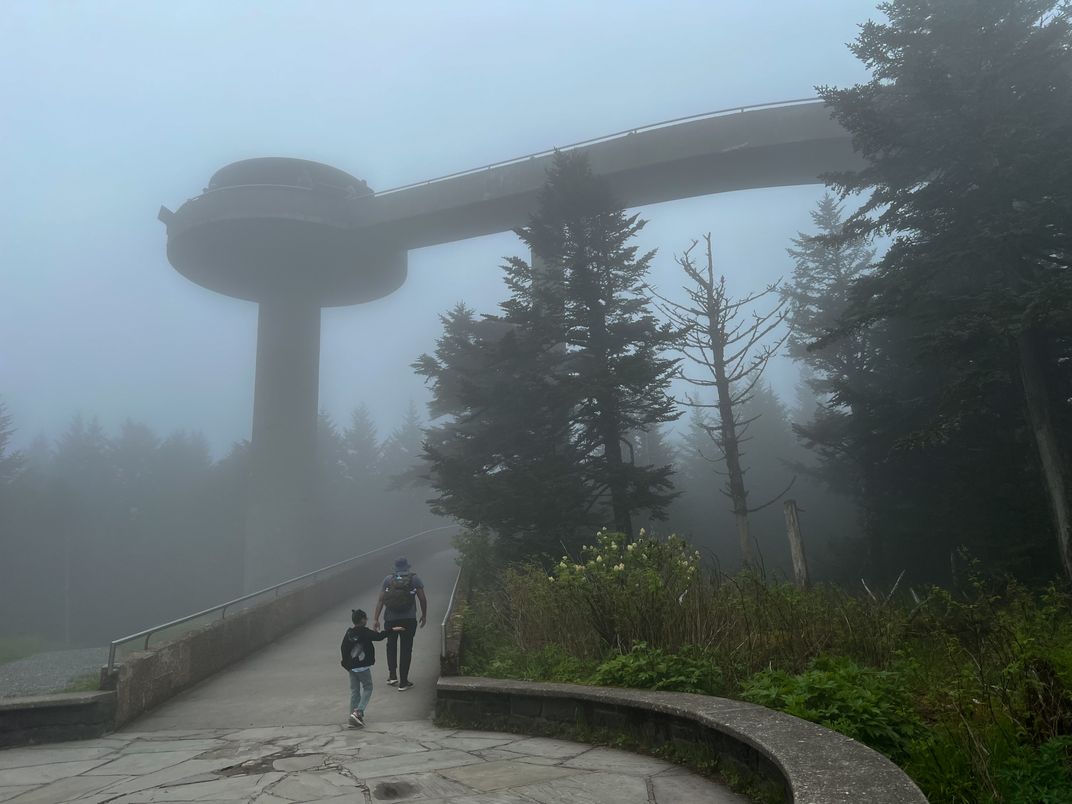 A father and daughter reach the base of Clingmans Dome Observation Tower. This massive structure stands 45 feet tall with a 375-foot ramp to the top. Built in 1959, the tower sits on Clingmans Dome, the highest point of the Great Smoky Mountains at an elevation of 6,643 feet.