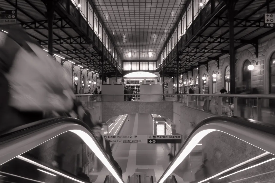 The photo shows the flow of people at Bologna Central Station, but also the atmosphere of the place, its symmetry, and its architecture. I really enjoy observing the atmosphere of stations.