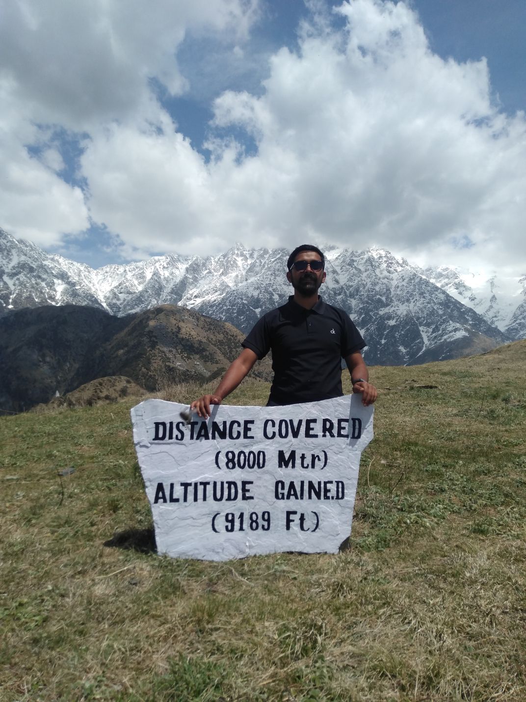 Caption - Feeling of achievement The photo was taken on the top of the Rising Star peak near Dhauladhar mountain range situated near Dharamshala. The photo shows my friend holding a piece of stone with distance traveled.