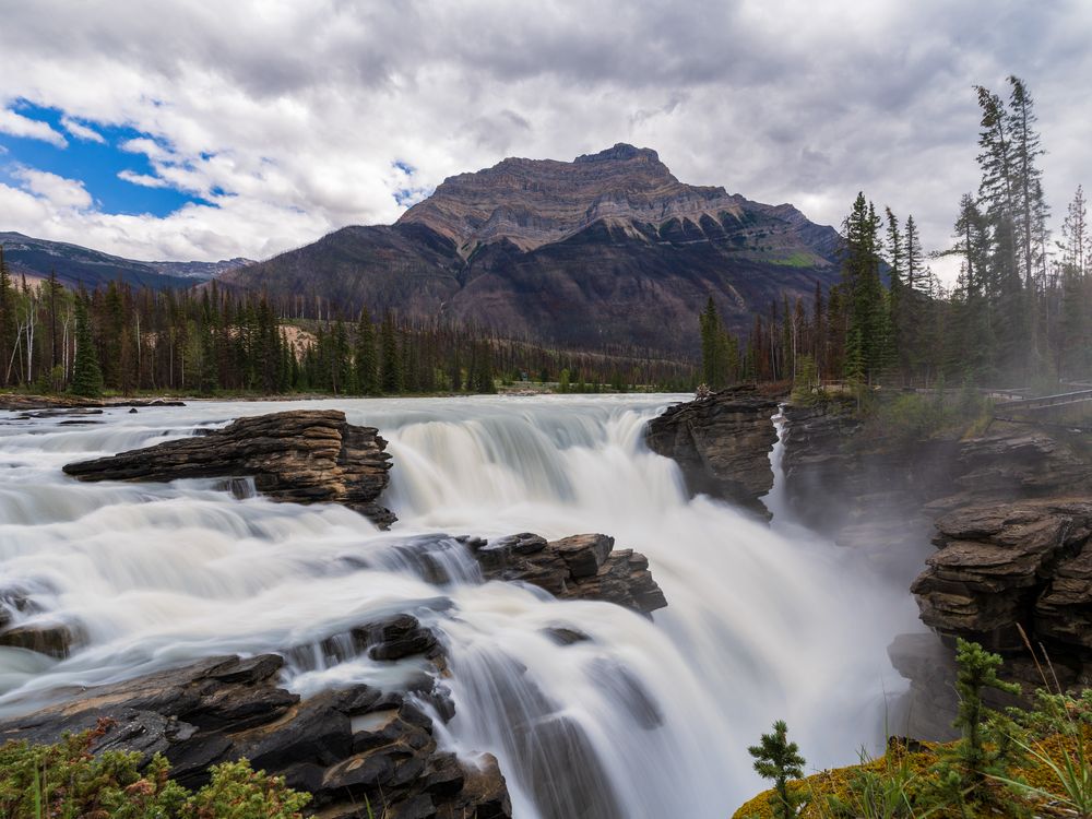 Athabasca Falls roars through layered rock under the peaks of Jasper National Park. The powerful water, mist, and dramatic mountain backdrop capture the raw energy of the Canadian Rockies.