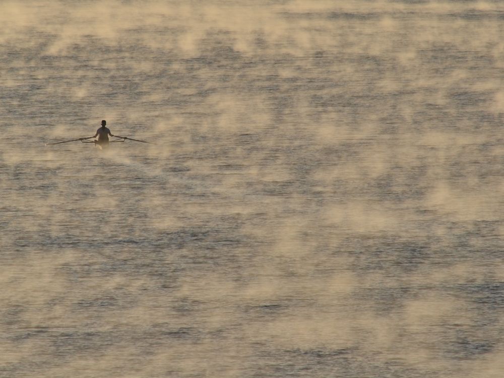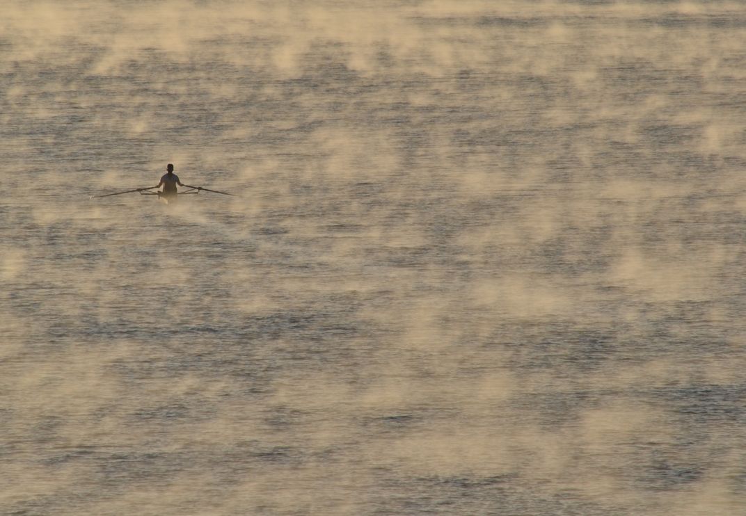 Athlete rowing training at dawn on Lake Parano in Brasilia, Brazil.