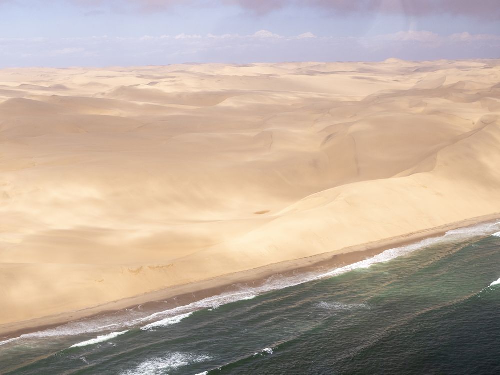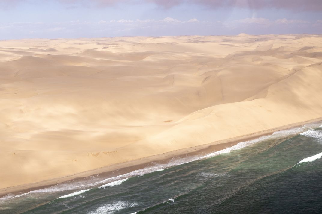 An aerial view over the beaches near Sandwich Harbour showing the sand dunes going straight into the Atlantic Ocean.