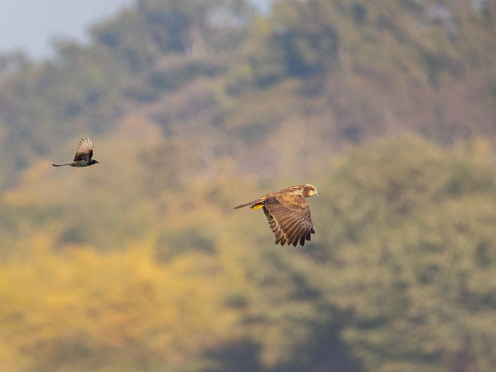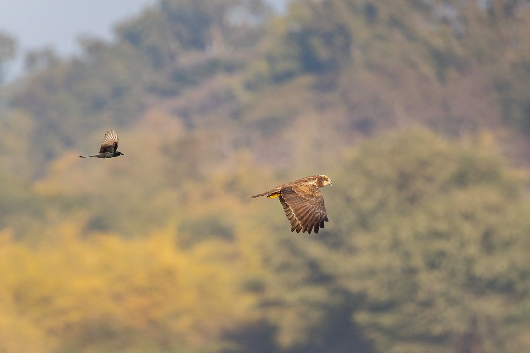Seen here is a little yet angry bird, Black Drongo mobbing off the Eurasian Marsh Harrier from its surroundings.