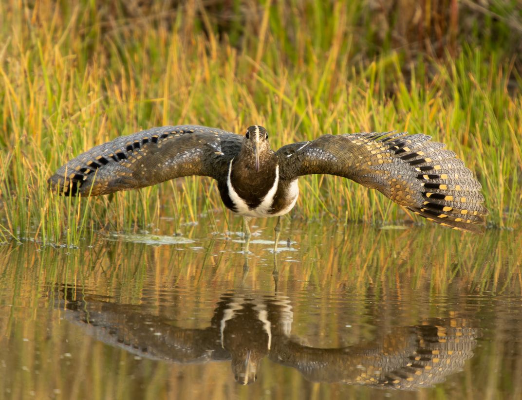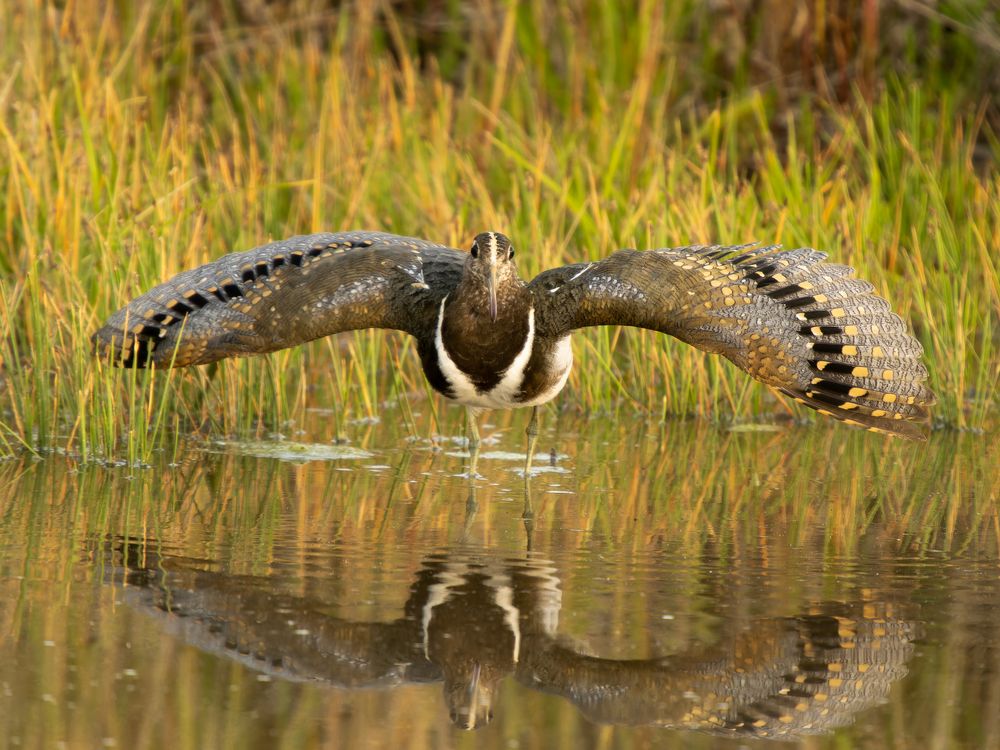 One of the rarest birds in Australia and the World. Rarely sighted and endangered. It is estimated there are only 340 birds left. Here this juvenile female Painted-snipe is in threat display when a Cockatoo flew into this location loudly squawking.