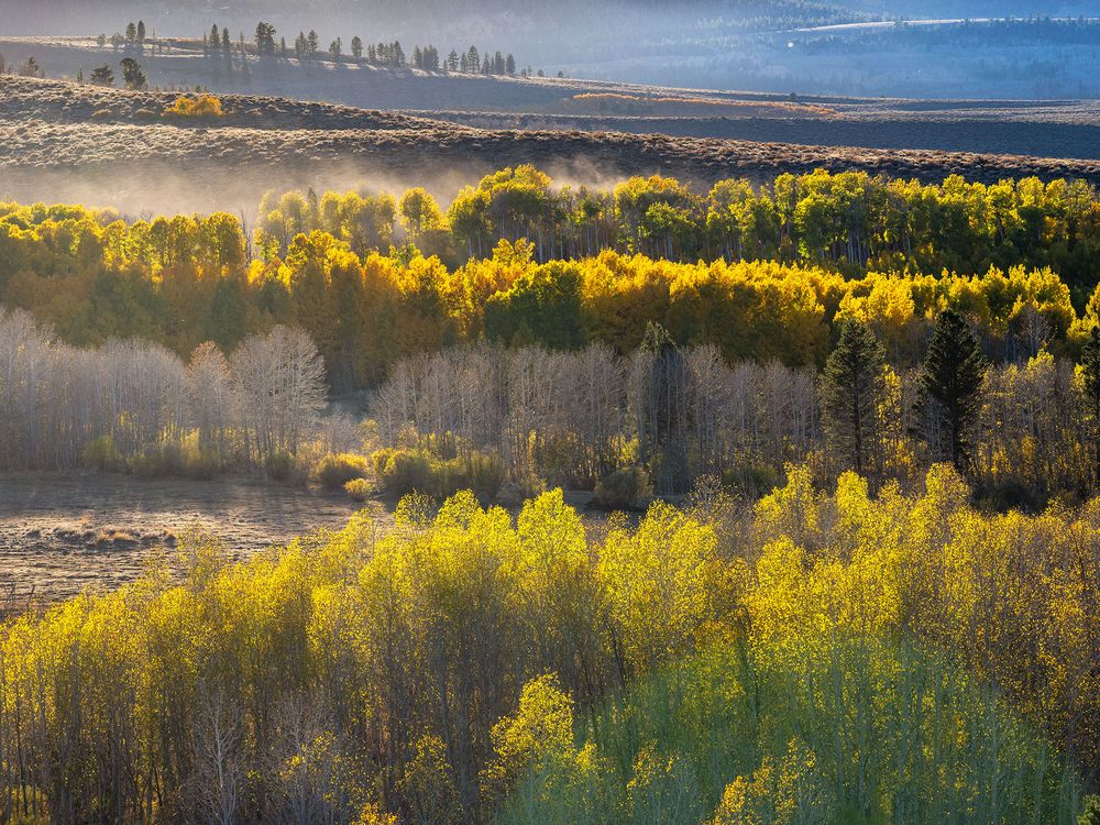 Many layers of ridges and steam lined with aspen trees create a zig-zag of aspen trees during an autumn afternoon along US 395 in Mono County, Calif.