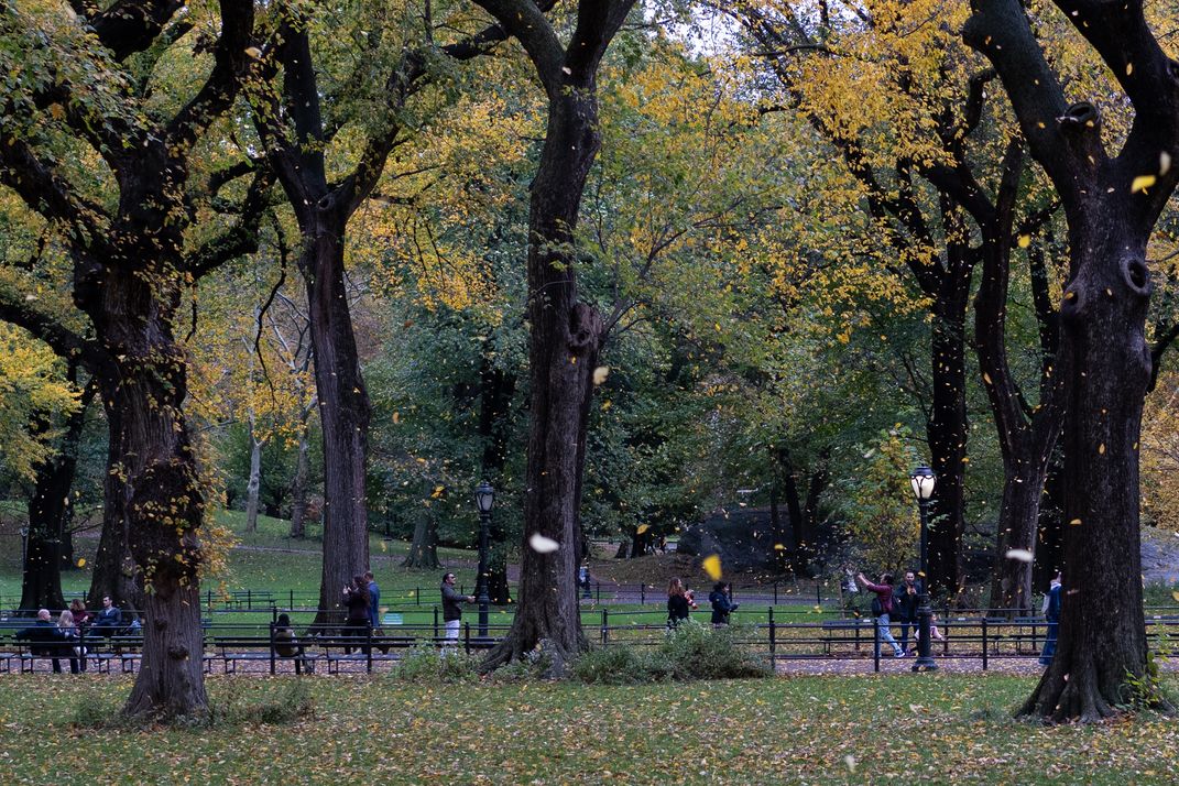 Catching falling leaves in autumn, in New York's Central Park.