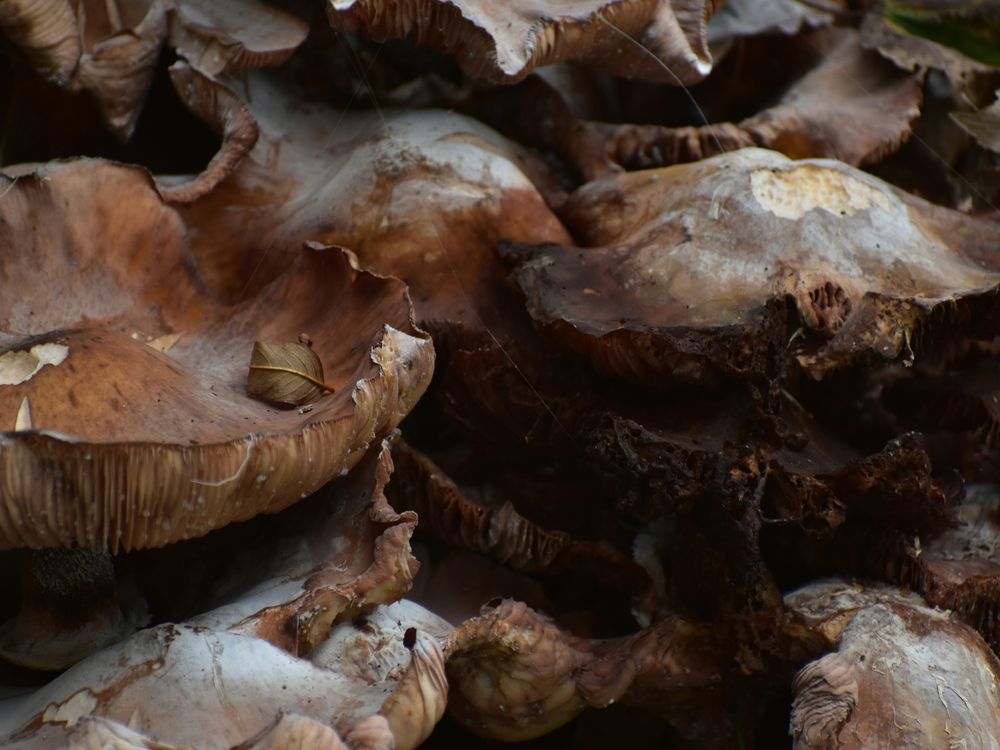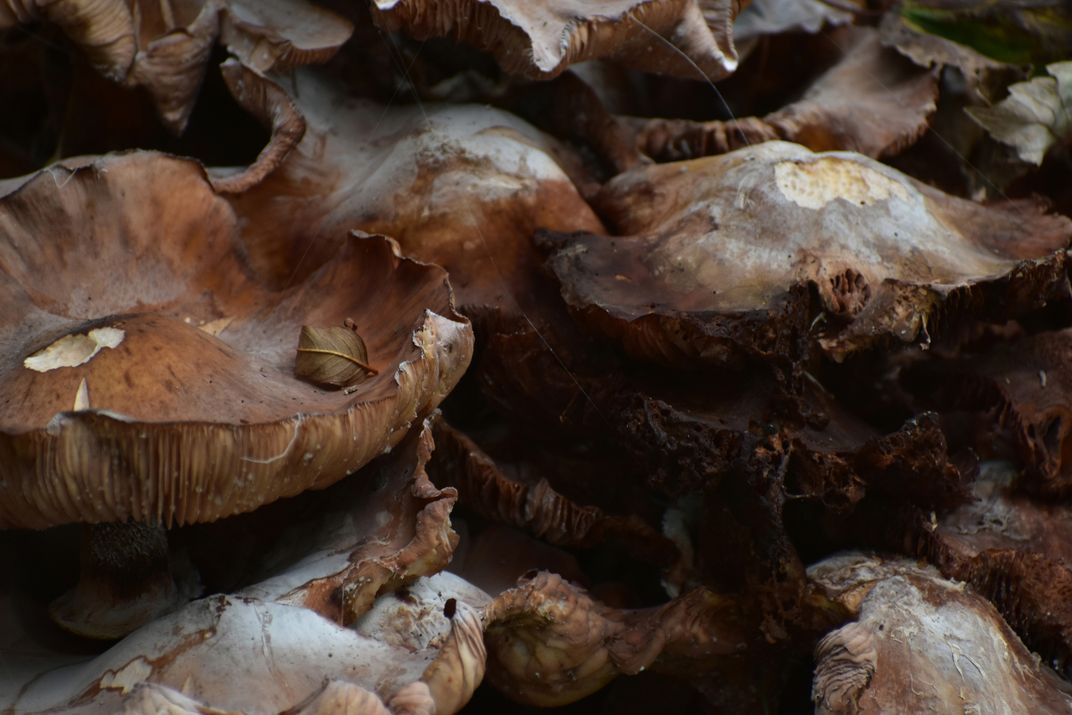 A solitary leaf sits in the bowl of a wild forest mushroom.