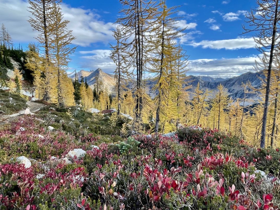 Larches and ground cover in flaming colors on a beautiful hike just off of the PCT in North Cascades National Park.