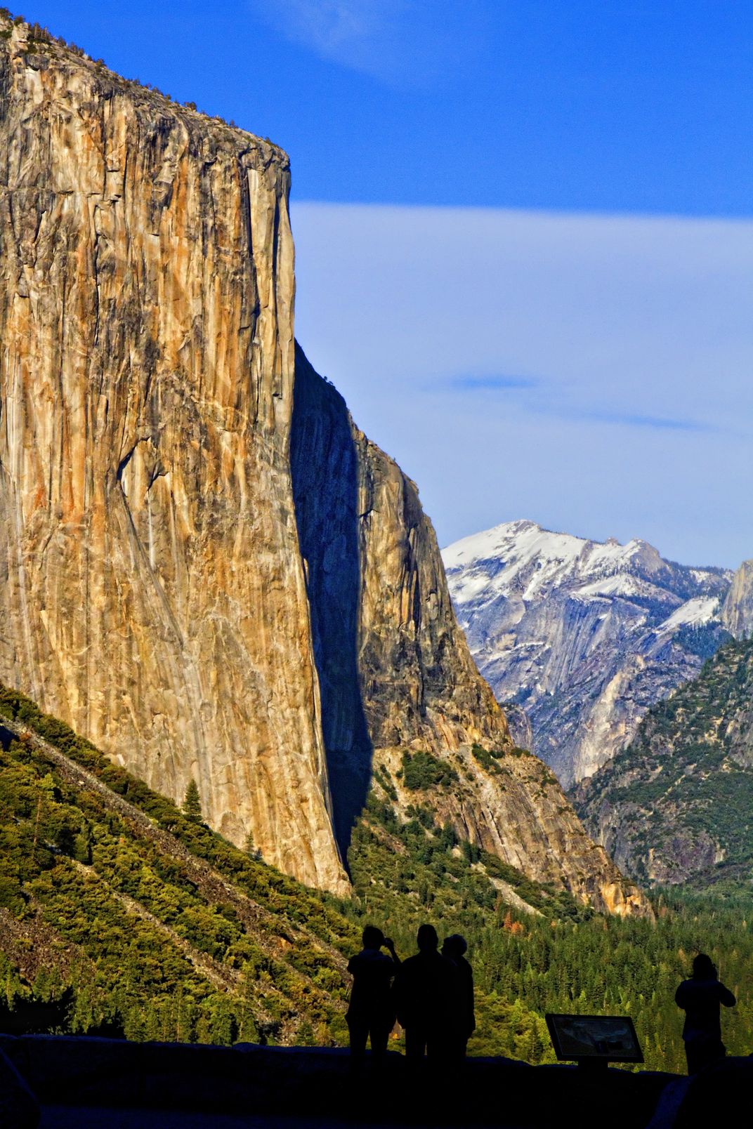Visitors stand at the Tunnel View scenic overlook entering Yosemite National Park.