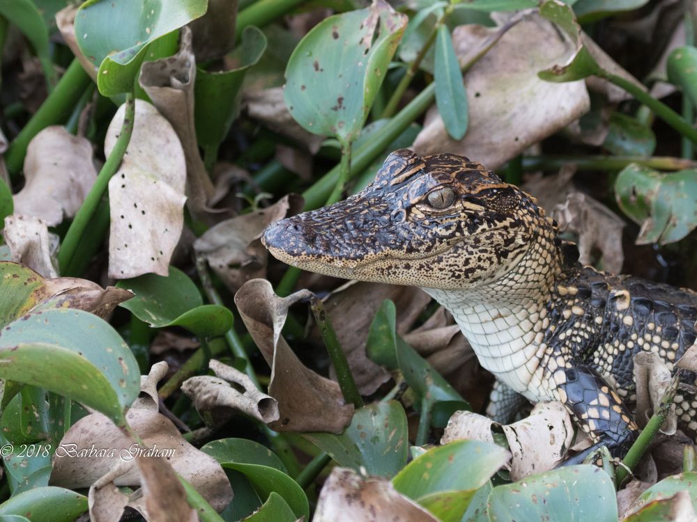 This baby gator had just flung himself off the road and come up in the midst of the leaves of these aquatic plants.