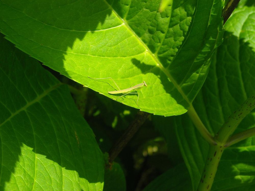 Baby Praying Mantis hiding on a leaf.