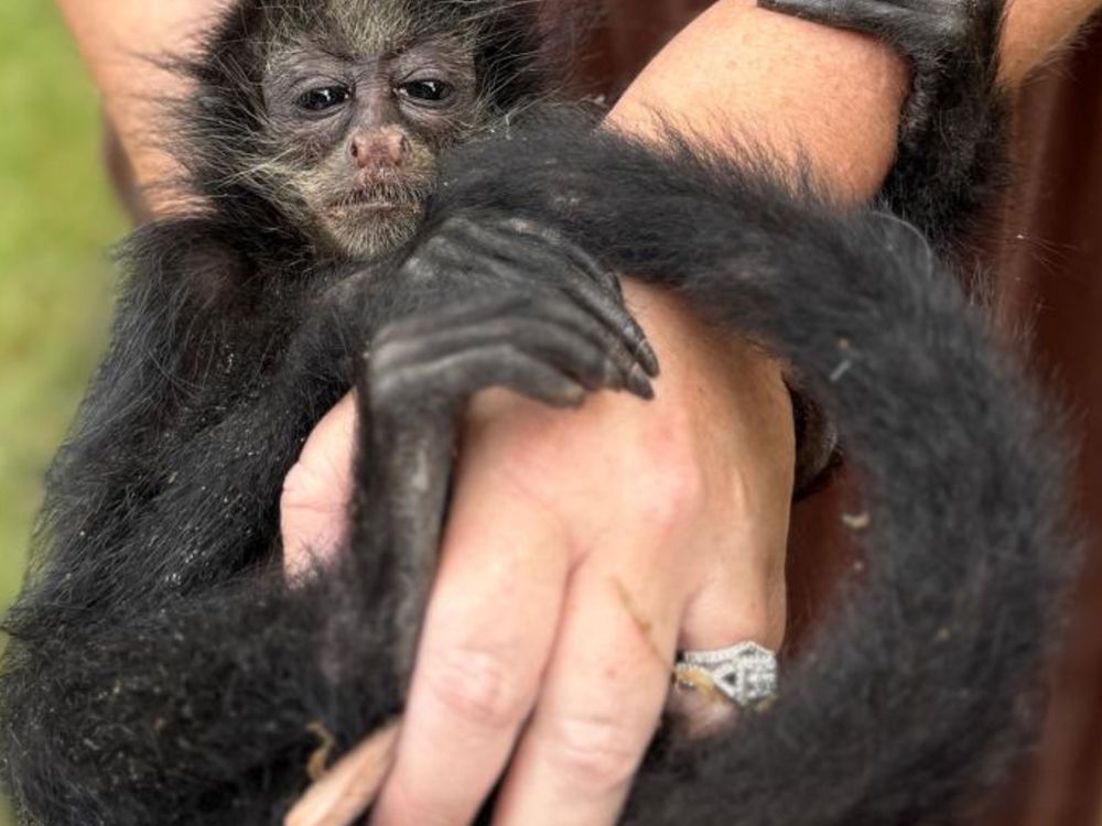 A young spider monkey curls its long limbs and tail around a human arm, clinging with a quiet mix of comfort and instinct. Its delicate fingers and expressive face speak to both its vulnerability and intelligence. The image captures the fragile bond between wildlife and people in Panama’s Emberá community, where rescued animals are cared for with tenderness and respect.