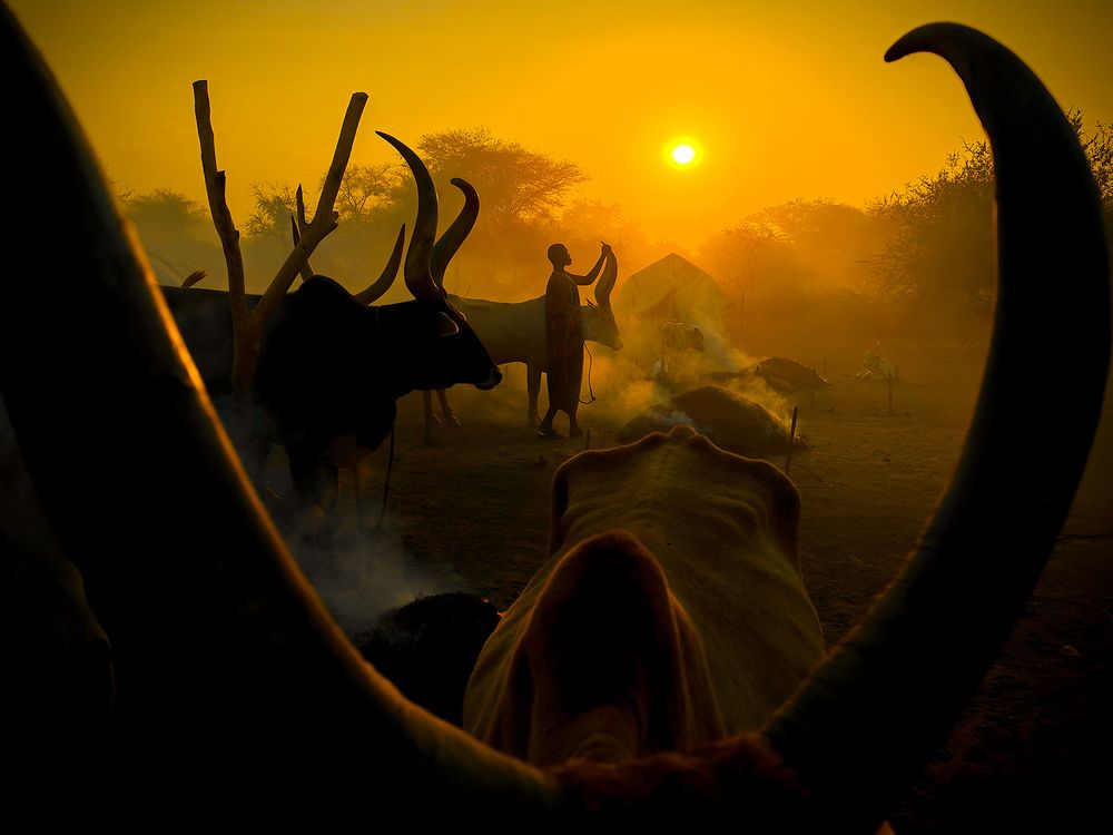 A member of the Mundari people in South Sudan decorates the horns of his Ankole cattle with clay as the setting sun illuminates the scene. The flames and smoke from burning dung merge with the golden glow of the sunset, creating a magical, almost surreal backdrop.