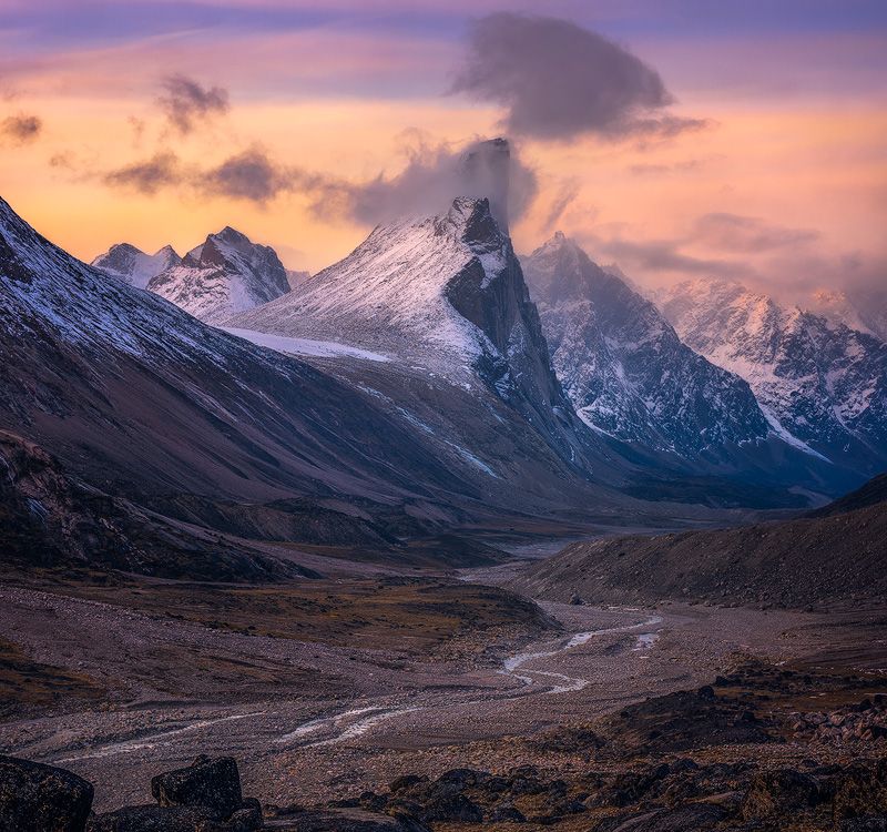 The Auyuittuq National Park on Baffin Island has many natural wonders. Mount Thor is one of them. It is the largest vertical drop on Earth. Its 1250 m of a 105 degrees sheer cliff is on the bucket list of almost every serious climber. Mt. Thor was teasing me for a long time. I wanted to check if it was as mysterious as its name and reputation. Now I can confirm first hand that it is as enigmatic as described. As I hiked through this gigantic valley, I had an impression that Mt. Thor behaved as a guard watching my every step. Each time when I made a turn, I saw Thor’s different angle. Since I was the only human in the entire park at that time, it felt quite comforting. When I reached this viewpoint near the Summit Lake, I decided to spend there a couple of days to capture Mt. Thor’s mysterious aura.