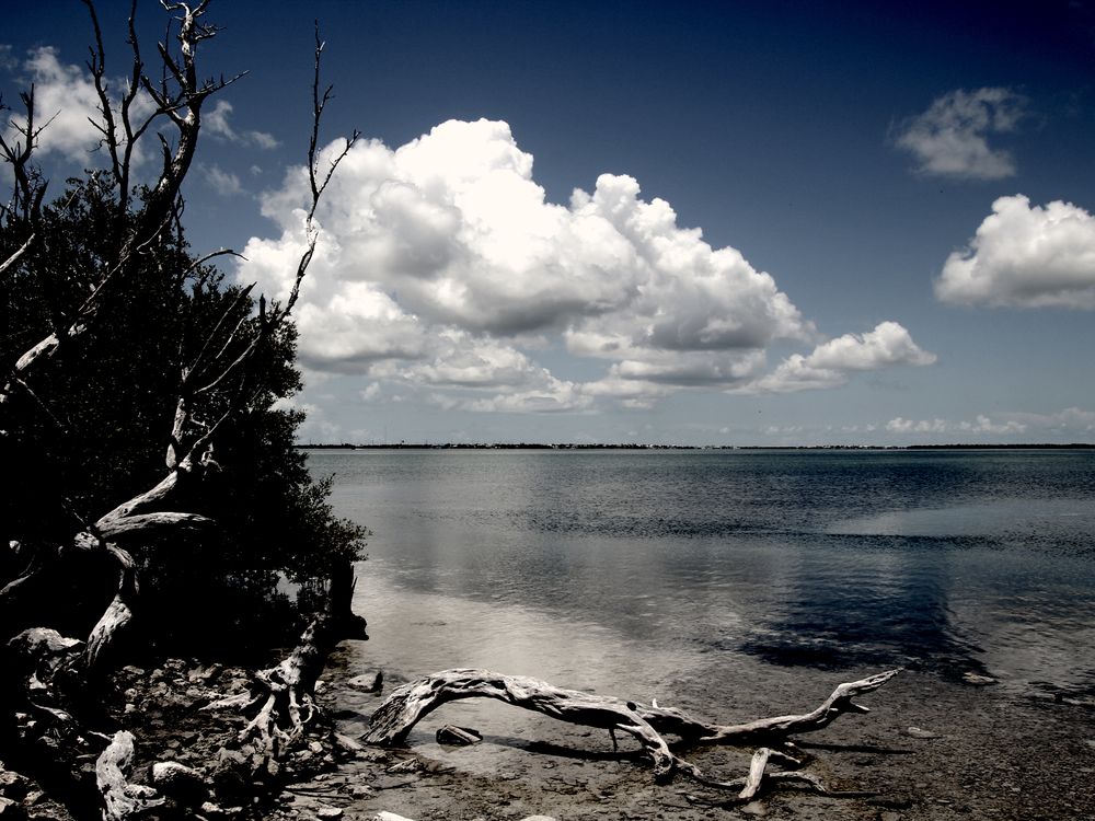 This photo shows woods, a piece of dead wood, water and clouds. This photo also show the landscape of this area in Bahia Honda, in the Florida Keys. I was driving around looking at the scenic imagery and found this spot that had a wooded area with some trees along with the piece of dead wood laying on the shoreline. Wanted to show the dramatics of the elements of the wood, clouds and water.