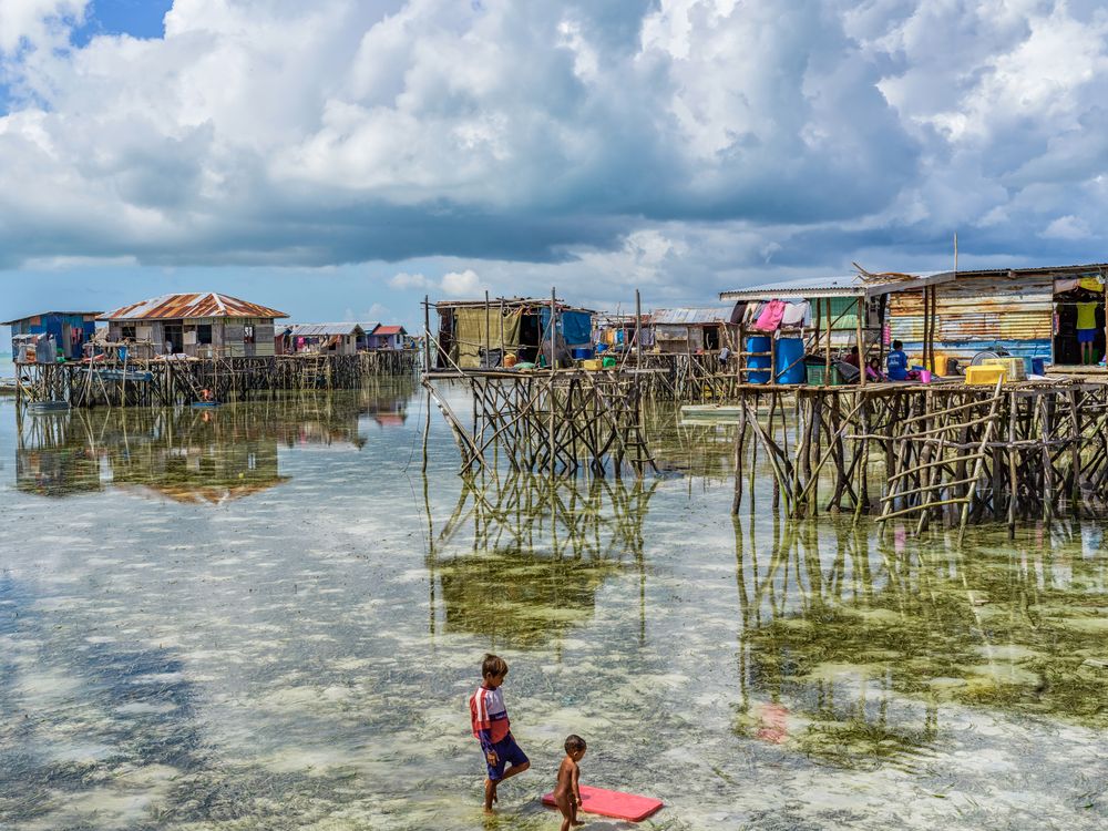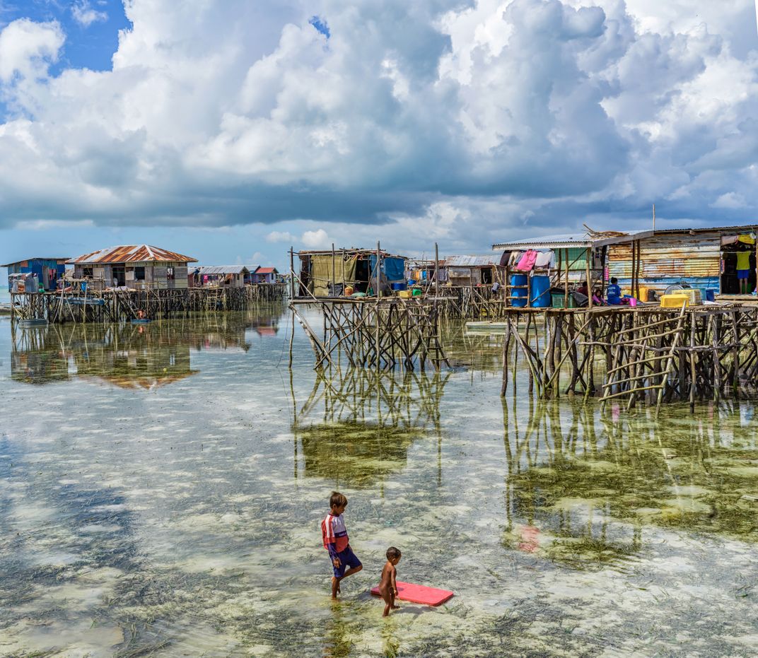 The Bajau, known as sea gypsies, have no country, but their lives are peaceful and cozy. Their gauga-framed wooden huts on the clear waters, children playing in the shallow sea, and the faint smoke and aroma of cooking floating out of the huts, blend in with the blue sky and white clouds and its reflections.