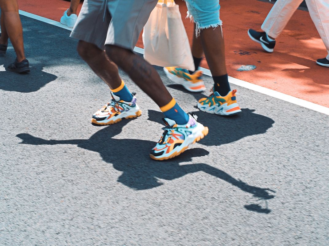 The photo depicts/highlights the colorful shoes and shadows of a couple of men at the 2022 Defend Black Women March in Washington DC. These men, along with others in attendance, were chanting and dancing to music in the background from a live go-go band while protesting the injustices facing women of color.