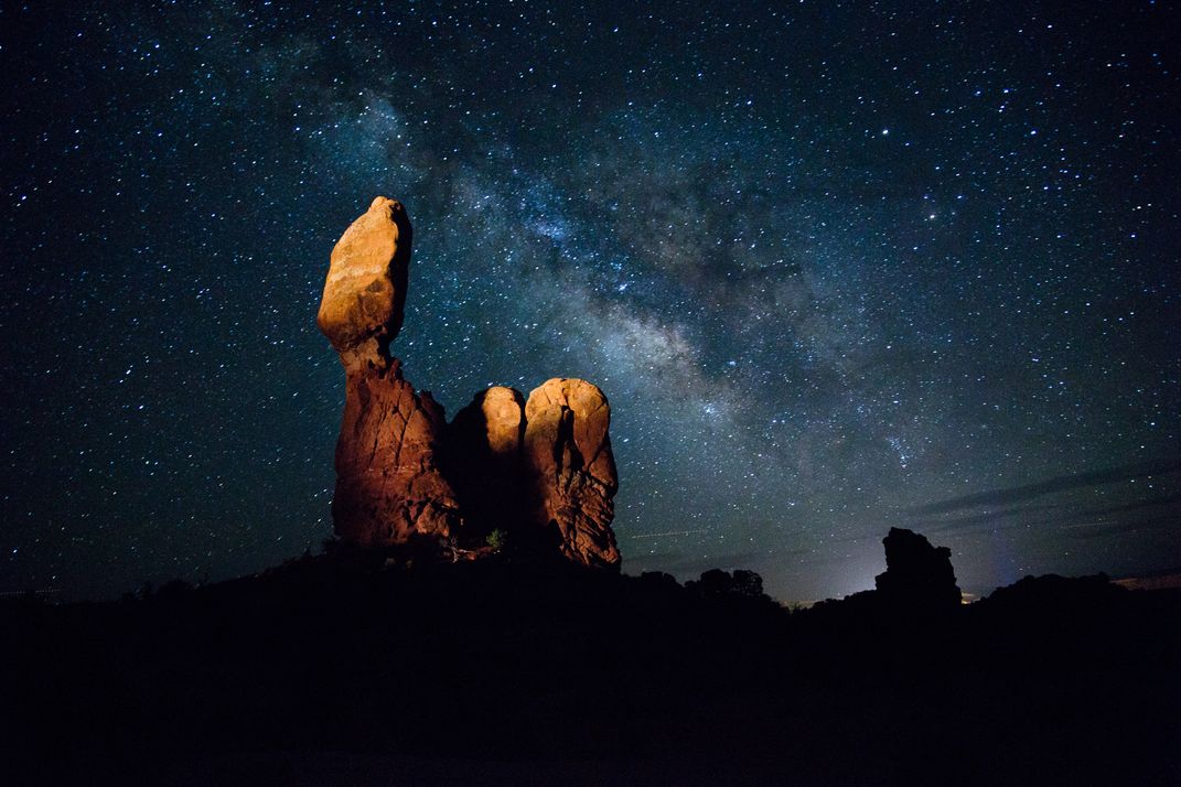 A popular formation found within Arches National Park, Balanced Rock becomes illuminated by passing headlights underneath the Milky Way Galaxy.