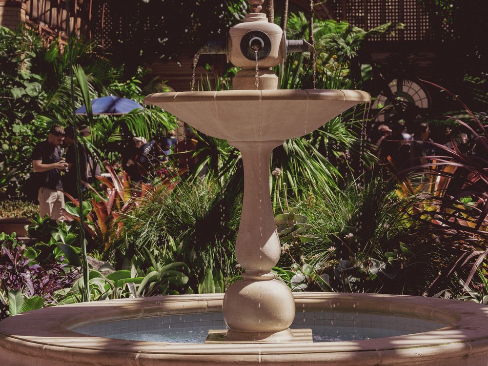 Inside of the Botanical Building of Balboa Park, a single fountain is brought to life by sunlight spilling through a lattice roof.