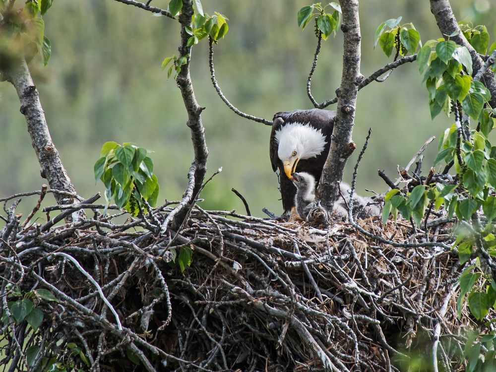 A bald eagle feeds its chick on the nest.