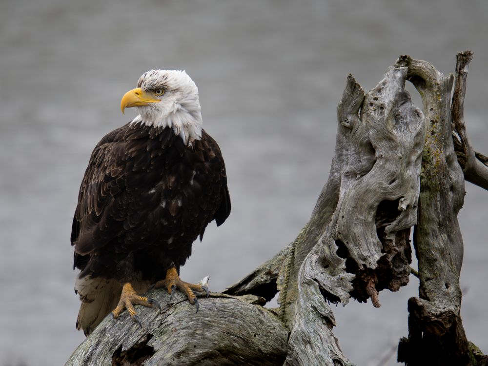 A nearly mature Bald Eagle sitting on a large piece of deadwood with gray water in the background.